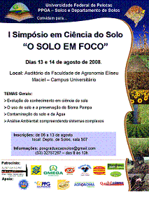 Será realizado nos dias 13 e 14 de agosto, no auditório da Faculdade de Agronomia Eliseu Maciel (Faem/UFPel), o Simpósio em Ciência do Solo “O solo em foco”. As inscrições podem ser feitas no Departamento de Solos, setor promotor do evento, de 6 a 13 de agosto. Os temas gerais do evento são: Evolução do conhecimento em ciência do solo, O uso do solo e a preservação do Bioma Pampa, Contaminação do solo e da água, e Análise ambiental – compreendendo sistemas complexos. Outras informações […]