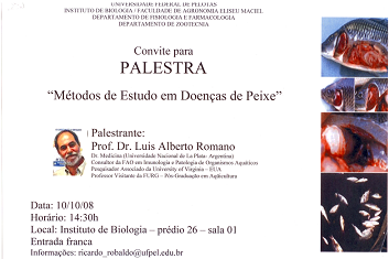 O Instituto de Biologia(IB), através do Departamento de Fisiologia e Farmacologia, está convidando para a palestra “Métodos de Estudo em Doenças de Peixe”, ministrada pelo professor Luis Alberto Romano, que ocorrerá na sexta-feira, dia 10 de outubro, às 14h30min, na sala um do prédio 26 do IB.