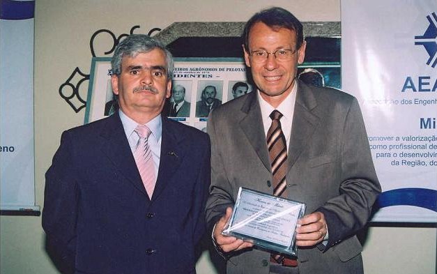 A Associação dos Engenheiros Agrônomos de Pelotas (Aepel), em jantar de gala, homenageou a área de Sementes da UFPel pela distinção obtida recentemente junto à Federação Latino-Americana de Sementes (Felas). Presidente da Aepel, João José da Cruz, entrega placa