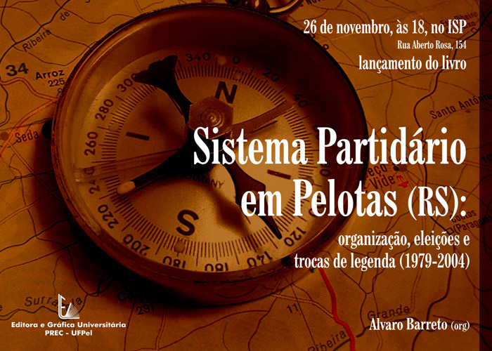 Será lançado dia 26, às 18h, no Instituto de Sociologia e Política(ISP) da UFPel, na rua Alberto Rosa, 154, o livro Sistema Partidário em Pelotas(RS), organização, eleições e trocas de legenda(1979-2004). A obra foi organizada pelo professor Álvaro Barreto e publicada pela Editora e Gráfica Universitária.