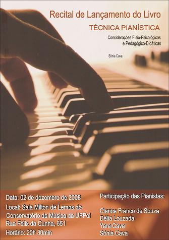 Nesta terça-feira(2), será realizado na Sala Milton de Lemos do Conservatório de Música da UFPel o lançamento do livro “Técnica Pianística: Considerações físio-psicológicas e pedagógico-didáticas”, da professora Sônia Cava. Para assinalar o acontecimento, está programado recital com as participações das pianistas Clarice Franco de Souza, Délia Louzada, Yara Cava, e da autora do livro, professora Sônia Cava, do Departamento de Música e Artes Cênicas do Instituto de Artes e Design da UFPel.