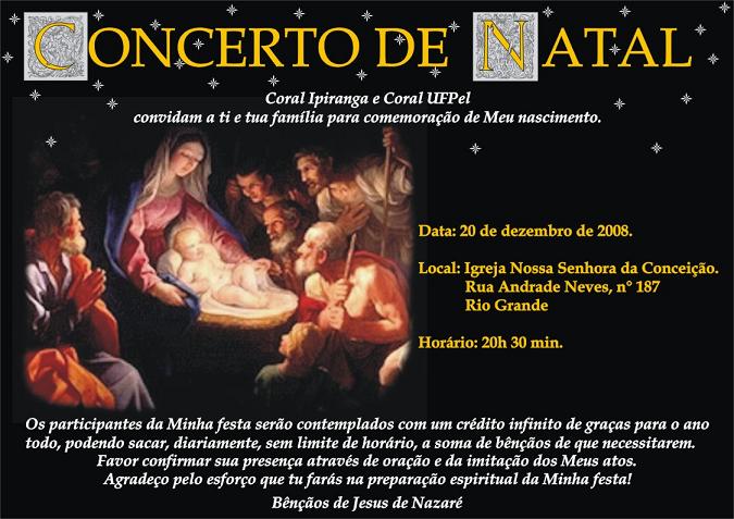 O Coral da UFPel e o Coral Ipiranga (Rio Grande) realizam neste sábado(20), às 20h30min, Concerto de Natal na Igreja N. Sra. da Conceição (rua Adrade Neves, 187),