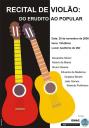 Nesta quinta-feira(20), às 19h30min, será realizado no Instituto de Artes e Design (IAD/UFPel) – rua Alberto Rosa, n° 62 – o Recital de Violão: do erudito ao popular, com as participações dos acadêmicos Alexandre Simon, Alzevir de Maicá, Bruno Soares, Eduardo de Medeiros, Gustavo Beroth, João Gomes e Roberto Pohlmann. O repertório a ser apresentado é formado por peças de Tom Jobim, Astor Piazzola, Heitor Villa Lobos, entre outros. O espetáculo tem entrada franca.