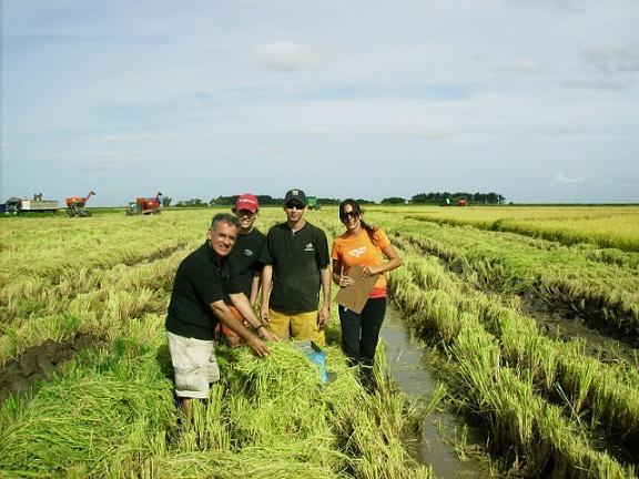 Bolsistas do Programa de Educação Tutorial (PET) e acadêmicos da Faculdade de Engenharia Agrícola(FEA/UFPel) e o professor da área de máquinas agrícolas da Faculdade, Carlos Tillmann, desenvolvem trabalho na safra 2008/2009 na Granja 4 Irmãos, em Rio Grande, com o objetivo de avaliar e quantificar as perdas na colheita mecanizada do arroz irrigado. ![]()
