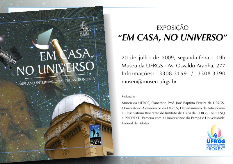 Os professores da UFPel Virgínia Mello Alves e Eduardo Fontes Henriques são subcuradores da exposição “Em Casa, no Universo”, que abrirá na segunda-feira, dia 20, no Museu da UFRGS, em Porto Alegre. A mostra é mais uma atividade do Ano Internacional da Astronomia(AIA), comemorado em 2009, em que a UFPel está participando. A exposição mostrará parte da história da Astronomia, com ênfase em Galileu e no telescópio, além de questões de pesquisa contemporânea em Astrofísica.
