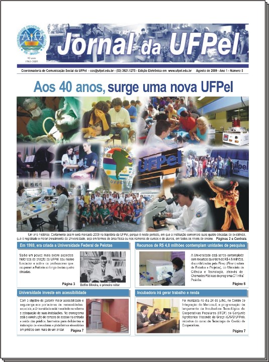 A edição especial do Jornal da UFPel, em comemoração aos 40 anos da Universidade, já está disponível para leitura. Acesse as edições através do link https://ccs2.ufpel.edu.br/wp/category/jornal/.