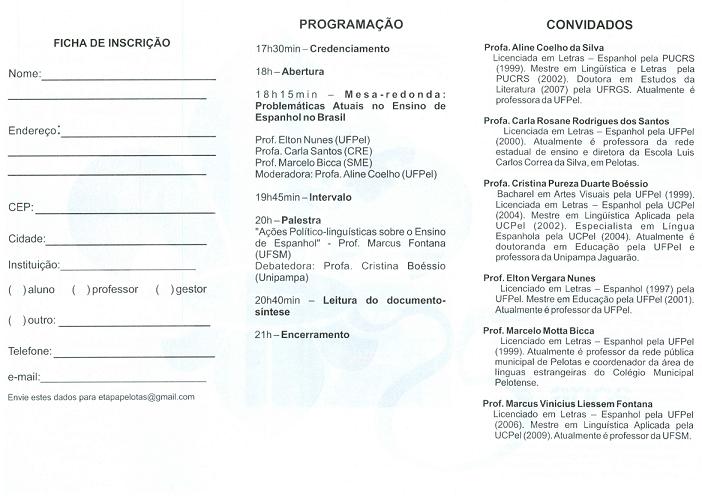 A etapa local do Encontro de Professores de Espanhol do Rio Grande do Sul, programada para esta quinta-feira(29), das 18h às 21h, debaterá as políticas públicas de ensino do espanhol no Brasil. O evento, que é uma realização do Departamento de Letras Estrangeiras (área de Espanhol) da Faculdade de Letras da UFPel, terá por local o Instituto São Benedito, na praça José Bonifácio, 102, em frente à catedral São Francisco de Paula. As inscrições são gratuitas. Veja a programação