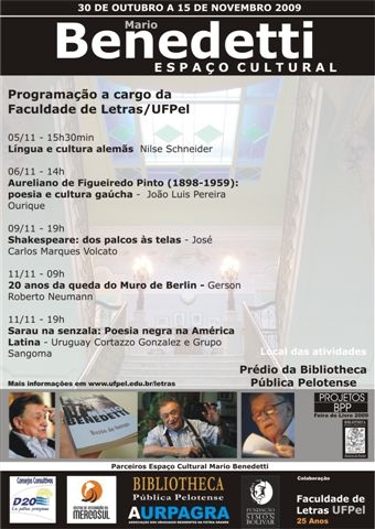A Faculdade de Letras da UFPel participa da programação do Espaço Cultural Mario Benedetti, montado na Praça Cel. Pedro Osório para centralizar as atividades que lembram a obra e a trajetória de vida do escritor uruguaio, homenageado especial da Feira do Livro. Serão cinco atividades, todas elas previstas para o prédio da Bibliotheca Pública Pelotense (BPP). Distribuídas pela manhã, tarde e noite (ver quadro abaixo), as atividades abordam desde a cultura alemã até os 20 anos da queda do Muro de Berlin, passando por poesia e cultura gaúcha, Shakespeare e poesia negra na América Latina.
