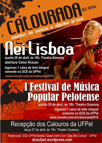 O DCE – Gestão quem vem com tudo não cansa – e UFPel convidam para a Calourada UFPel 2010 – A sociedade em debate, a realizar-se de 27 de abril a 8 de maio. O evento, constituído de shows, palestras, oficinas temáticas e atividades culturais, será uma espécie de trote cultural, com diversas atividades programadas para os diversos campi da UFPel.