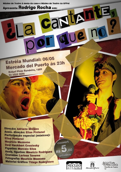 O Núcleo de Teatro à Moda da Casa, em parceria com o Núcleo de Teatro da UFPel, estreia na próxima quinta-feira(6), às 23h, no parillada Mercado del Puerto (rua Rafael Pinto Bandeira, 1889 – telefone: 3222-0686), o espetáculo cômico-musical: “¿La cantante, por que no?”