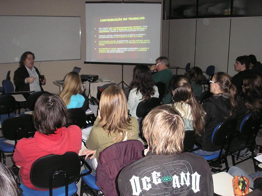 O engenheiro Claudio Adir de Sousa palestrou no dia 28 para os alunos do curso de Engenharia Sanitária e Ambiental da UFPel, abordando o tema Saneamento e o problema das enchentes na cidade de Pelotas.