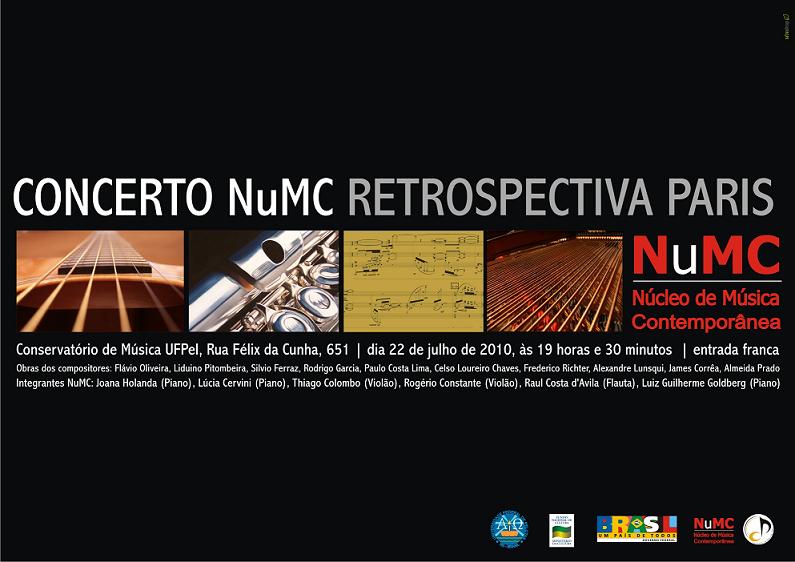 O Conservatório de Música da UFPel promove, nesta quinta-feira(22), às 19h30min, o Concerto NuMC – Restrospectiva Paris. O programa consta de parte das obras apresentadas no Cycle de Musique Contemporaine du Brésil, em Paris, em março deste ano. O espetáculo tem entrada franca.Serão apresentadas obras de Flávio Oliveira, Liduino Pitombeira, Silvio Ferraz, Rodrigo Garcia, Paulo Costa Lima, Celso Loureiro Chaves, Frederico Richter, Alexandre Lunsqui, James Corrêa, Almeida Prado.