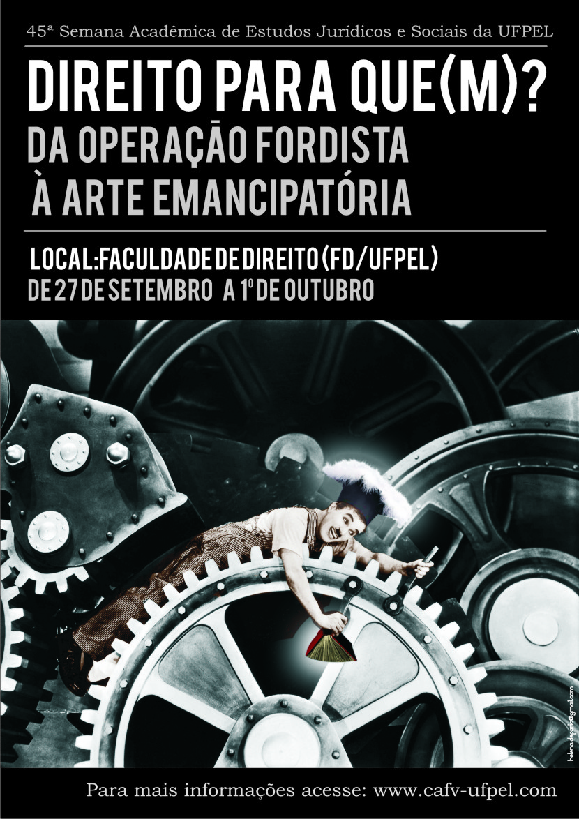 Mostra de Pesquisa da 45ª Semana Acadêmica de Estudos Jurídicos e Sociais da UFPel Inscrições até as 20h do dia 23/09, no valor de R$ 5,00. Os participantes do evento são isentos. Edital no sítio virtual do Centro Acadêmico Ferreira Viana Tarde – 17h