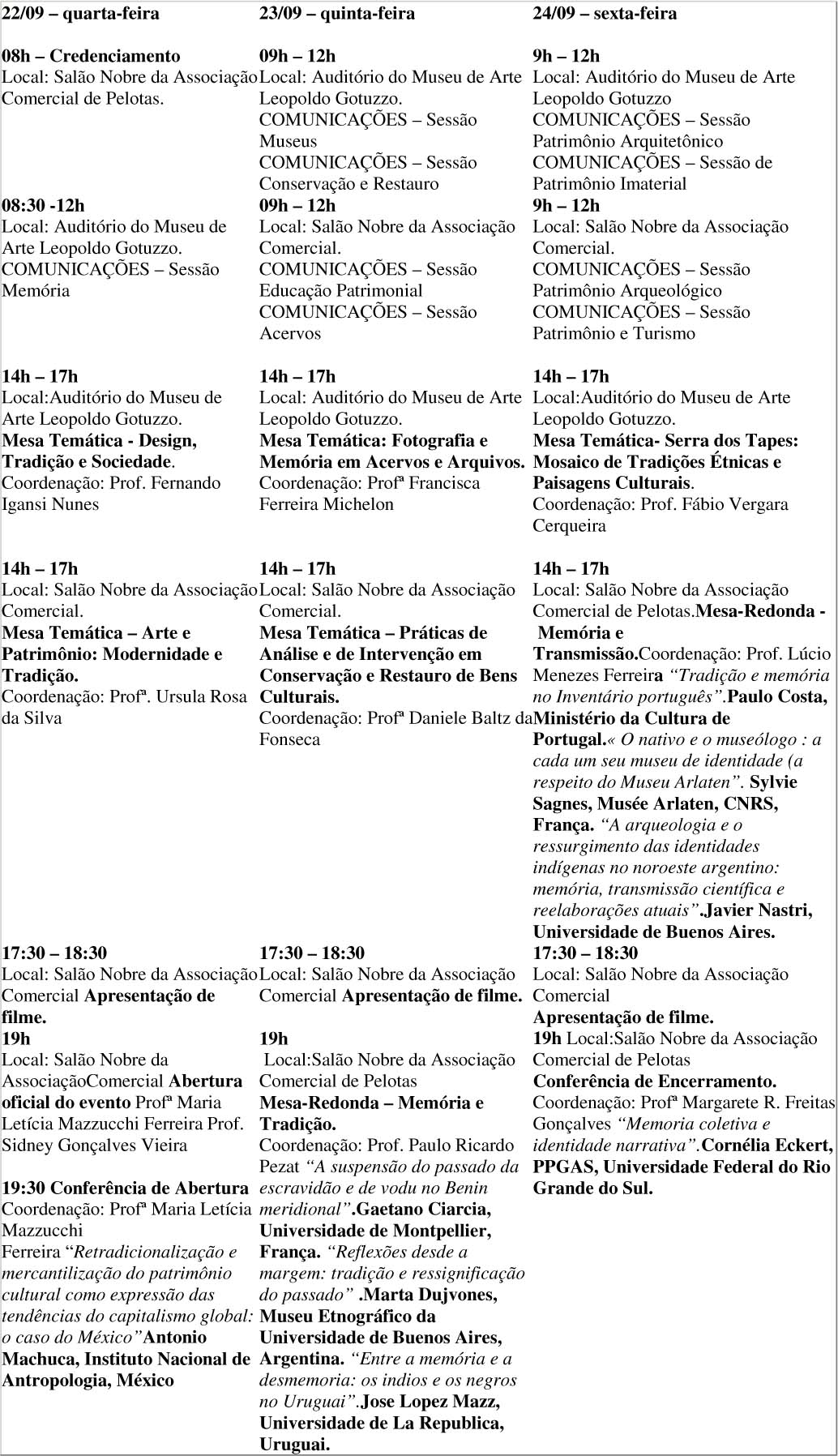 A solenidade de abertura ocorreu nesta quarta(22). O tema central desse evento é a Tradição e, para isso, os palestrantes convidados irão trazer análises e reflexões de pesquisa que serão motivadoras das discussões. O evento, que conta com o apoio das agências de fomento à pesquisa Fapergs e Capes, tem por local o salão nobre da Associação Comercial (rua Sete de Setembro, 274- 7º andar), bem como o auditório do Museu de Arte Leopoldo Gotuzzo – rua General Osório, 725.
