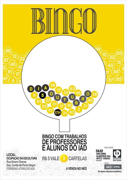 Está programado para a tarde da próxima terça-feira, 5 de outubro, uma atividade agradável, com a realização de um bingo, promovido pelos alunos do Programa de Extensão Tutorial – PET Artes Visuais, e Diretório Acadêmico, com a finalidade de angariar recursos para realização da Semana Acadêmica do Curso de Artes Visuais. A premiação será em forma de obras de arte doadas por professores e alunos dos cursos de Artes e Design. A atividade terá início às 17h, no terreno de ocupação localizado atrás do prédio do Instituto de Artes e Design, onde estará acontecendo, paralelamente, a atividade: “Ocupação: a arte sob deslocamentos provisórios”. Entrada pela rua Álvaro Chaves, quase esquina Conde de Porto Alegre. Informações no NED/IAD.