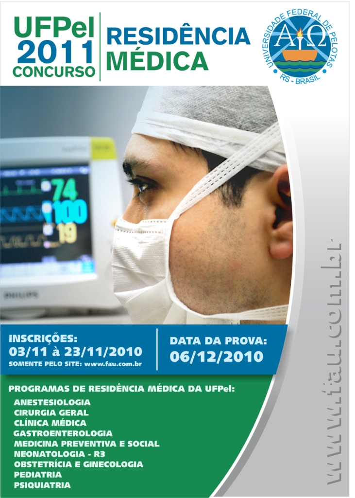 O programa de residência médica da UFPel abriu inscrições visando o ingresso em 2011. Confira todas as informações clicando na imagem no começo do texto e nos arquivos edital-residencia-2011.doc e manual-do-candidato-2011.doc.