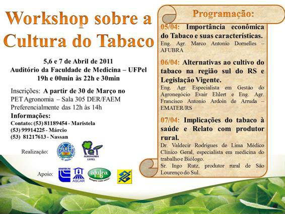 Tendo em vista a importância desta cultura para o estado e a polêmica acerca da mesma, o grupo promove o evento no intuito de discutir e refletir sobre o assunto com toda a comunidade. As inscrições podem ser feitas na sala do grupo na Faculdade de Agronomia Eliseu Maciel (Faem/UFPel) – Departamento de Engenharia Rural, sala 305 – preferencialmente no horário entre 12h e 14h. Mais informações no site: http://petfaem.wordpress.com/.
