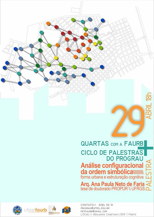 A palestra intitulada Análise configuracional da ordem simbólica: forma urbana e estruturação cognitiva refere-se à tese de doutorado defendida recentemente pela professora Ana Paula Faria no PROPUR-UFRGS. Arquiteta urbanista, formada pela FAUrb – UFPel, Ana Paula possui mestrado e doutorado em planejamento urbano e regional pelo Programa de Pós Graduação