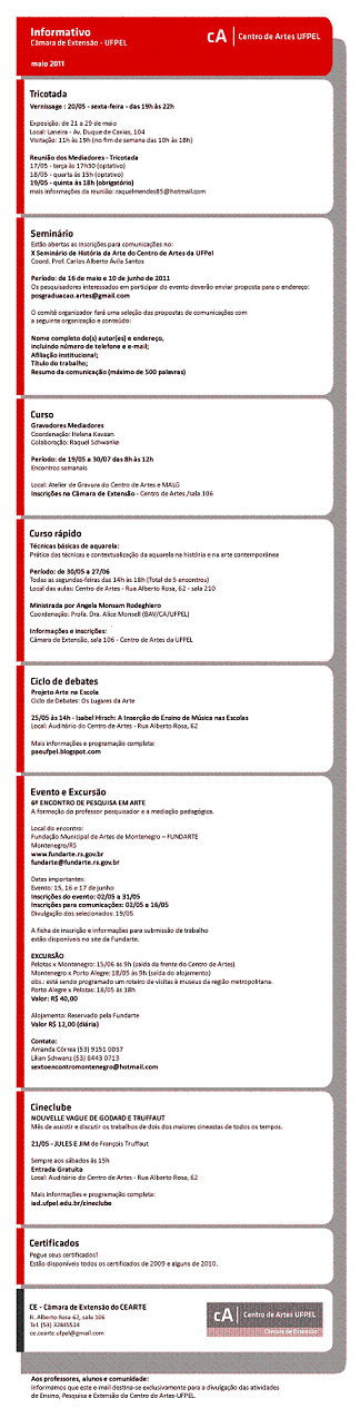 Aos professores, alunos e comunidade: Informamos que este e-mail destina-se exclusivamente para a divulgação das atividades de Ensino, Pesquisa e Extensão do Centro de Artes-UFPEL.