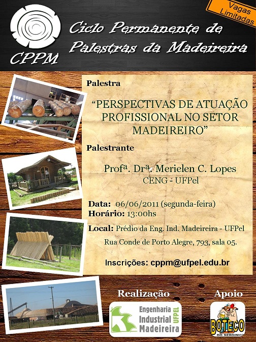 No dia 6 de junho (segunda -feira) ocorrerá mais um encontro do Ciclo de Palestras Permanentes da Engenharia Industrial Madeireira (CPPM), quando a professora Merielen C. Lopes falará sobre as Perspectivas de atuação profissional no setor madeireiro. Mais informações no cartaz no começo do texto.