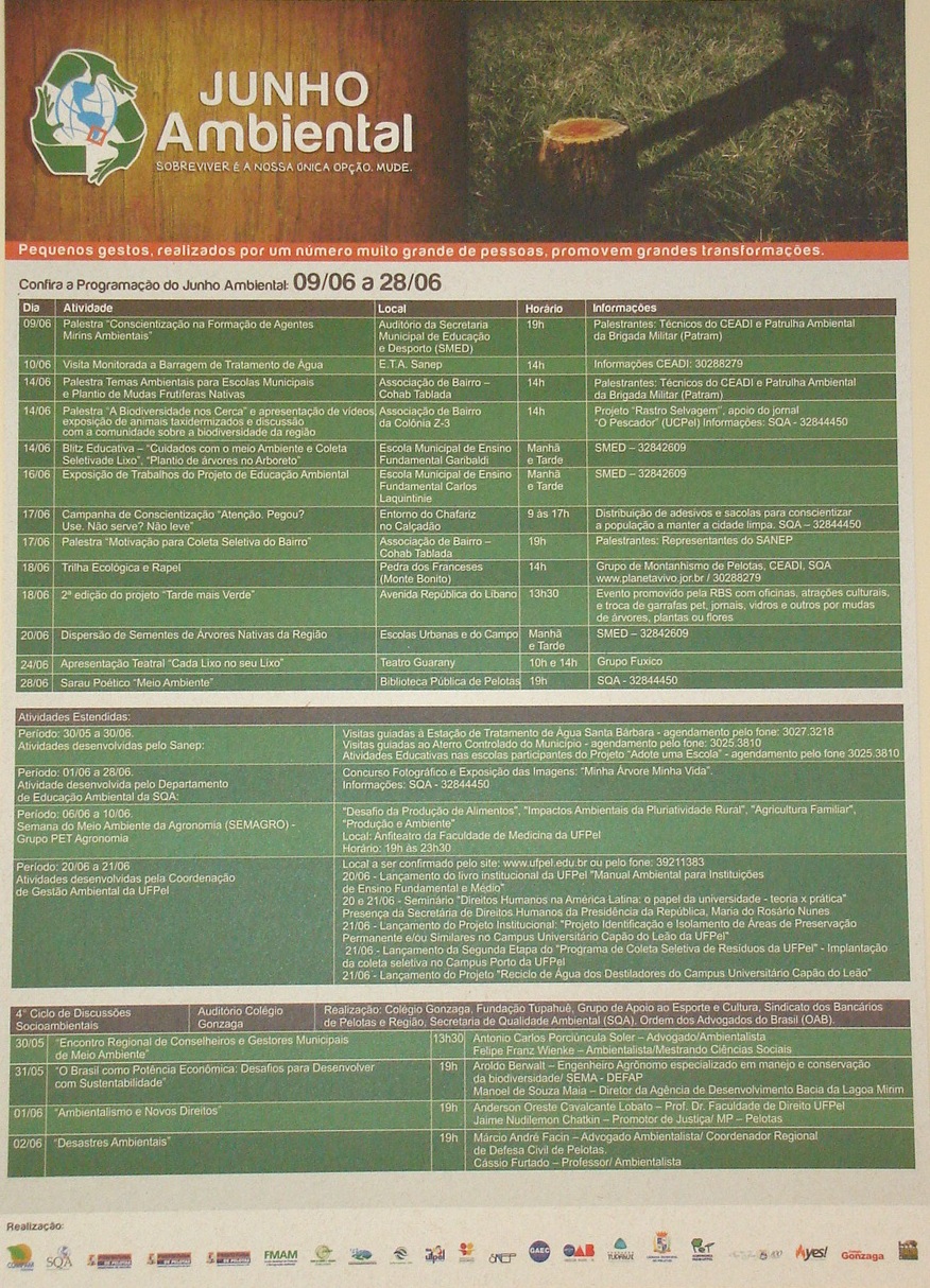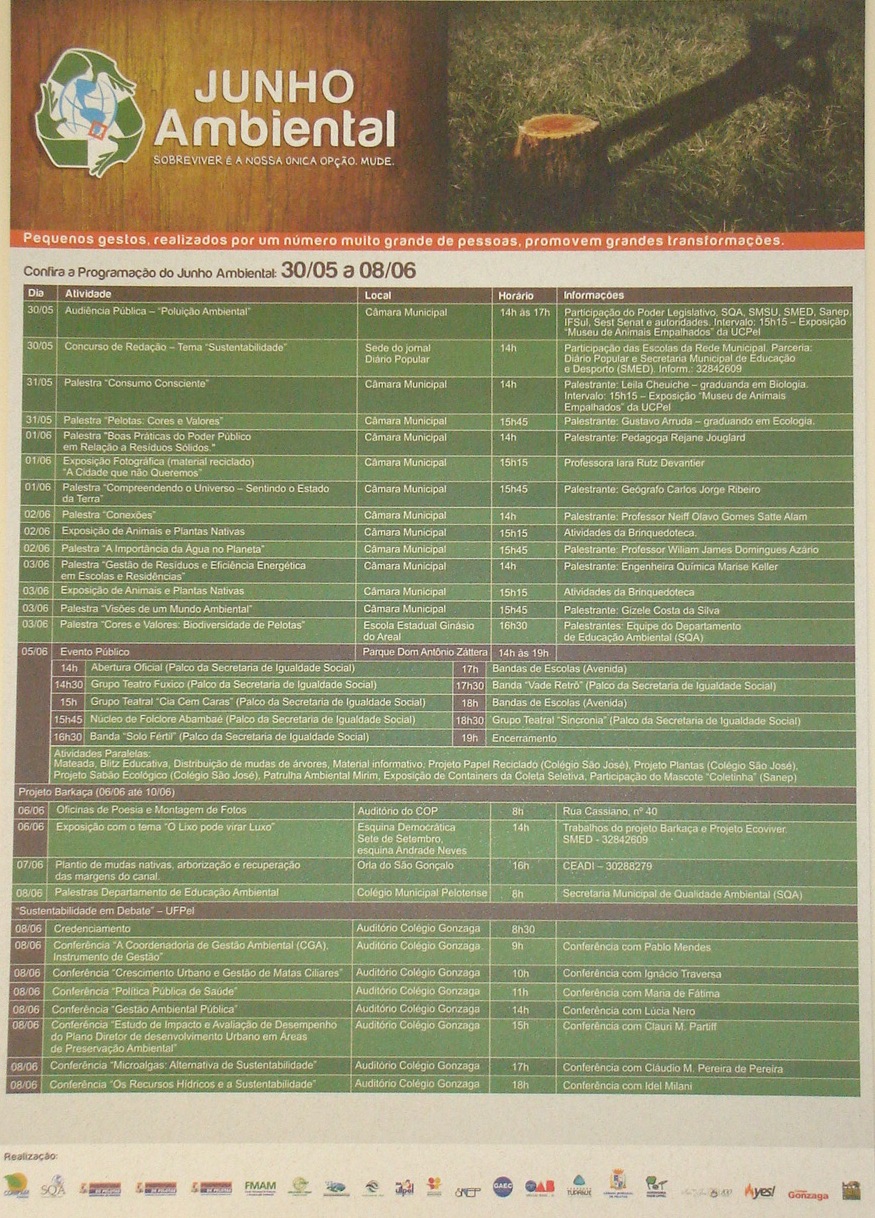 A Coordenadoria de Gestão Ambiental da UFPel realizará uma programação especial nesta quarta-feira, dia 8 de junho, nos três turnos, das 8h30min às 20h, para comemorar a Semana do Meio Ambiente. O local será o auditório do Colégio Gonzaga. Inscrições no local, no valor de R$ 10,00. As vagas são limitadas e será concedido certificado. A programação da UFPel está inserida na atividade Junho Ambiental, desenvolvida em Pelotas. Confira as programações clicando nas imagens e no arquivo programao-da-semana-do-meio-ambiente-cga-ufpel.pdf.