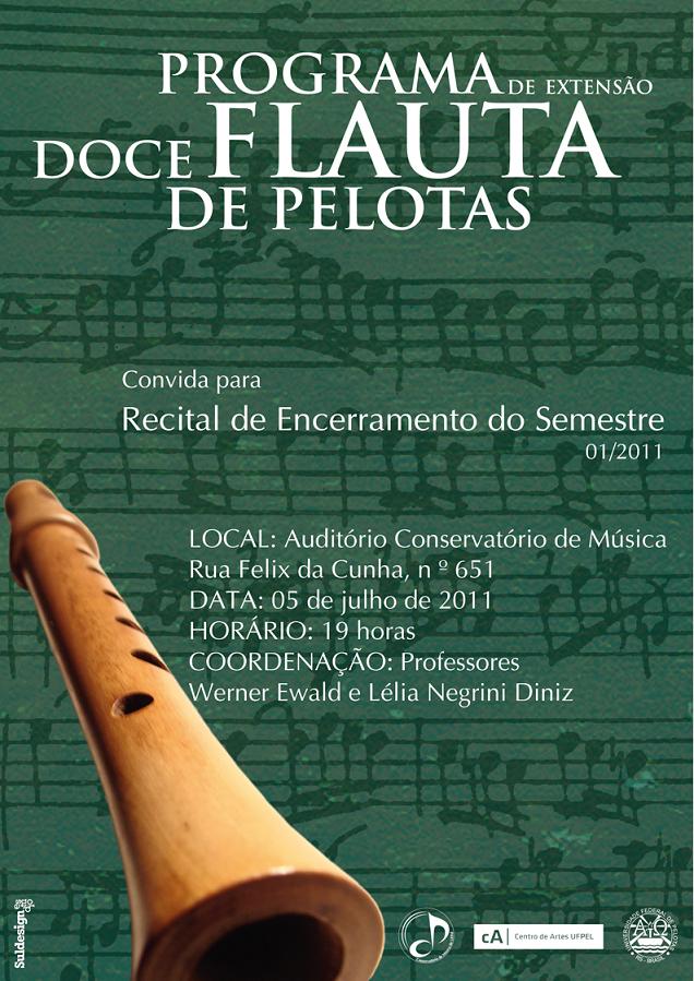 O Programa de Extensão Doce Flauta de Pelotas promove recital de encerramento do semestre 01/2011. Será no Auditório Milton de Lemos, do Conservatório de Música da UFPel, no próximo dia 5 de julho, às 19h. A coordenação está a cargo dos professores Werner Ewald e Lélia Negrini Diniz.
