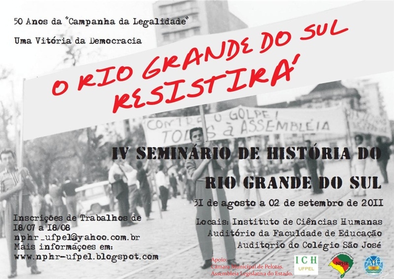 Será realizado de 31 de agosto a 2 de setembro, o IV Seminário de História do Rio Grande do Sul – 50 Anos da “Campanha da Legalidade” – Uma Vitória da Democracia. O evento é organizado pelo Núcleo de Pesquisa em História Regional da UFPel.