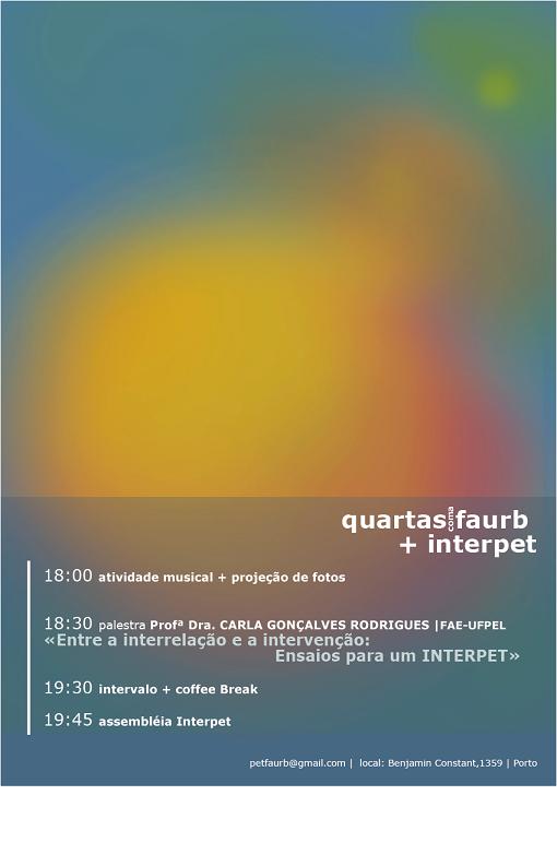 As atividades se iniciarão no saguão da FAUrb às 18h, com presença musical de artista local e projeções simultâneas de fotos do grupo PET da FAUrb. Às 18h30min haverá uma palestra com a professora Carla Gonçalves Rodrigues, da Faculdade de Educação da UFPel, intitulada: Entre a interrelação e a intervenção: Ensaios para um INTERPET. Às 19h45min se iniciará a assembléia do INTERPET, que reúne os grupos PET da UFPel.