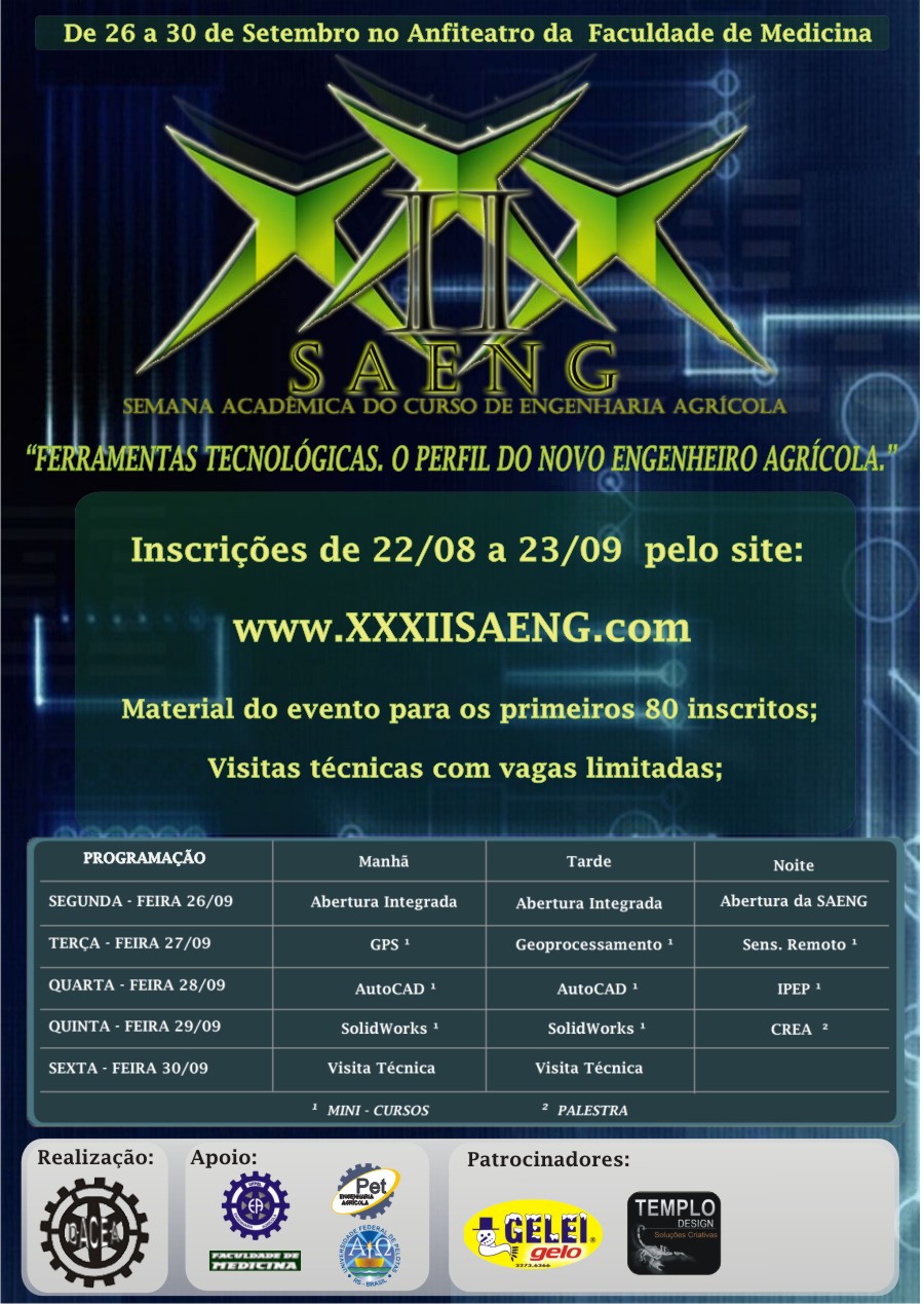 De 26 a 30 de setembro, no Anfiteatro da Faculdade de Medicina da UFPel, ocorrerá a XXXII SAENG – SEMANA ACADÊMICA DO CURSO DE ENGENHARIA AGRÍCOLA, evento anual organizado pelo Diretório Acadêmico do Curso de Engenharia Agrícola. O encontro tem como título “FERRAMENTAS TECNOLÓGICAS. O PERFIL DO NOVO ENGENHEIRO AGRÍCOLA” e contará com diversos mini – cursos, que visarão a maior qualificação do acadêmico. O prazo das inscrições vai de 22 de agosto a 23 de setembro. Os participantes devem estar atentos aos prazos, pois as inscrições são limitadas, bem como o material do evento e as visitas técnicas.