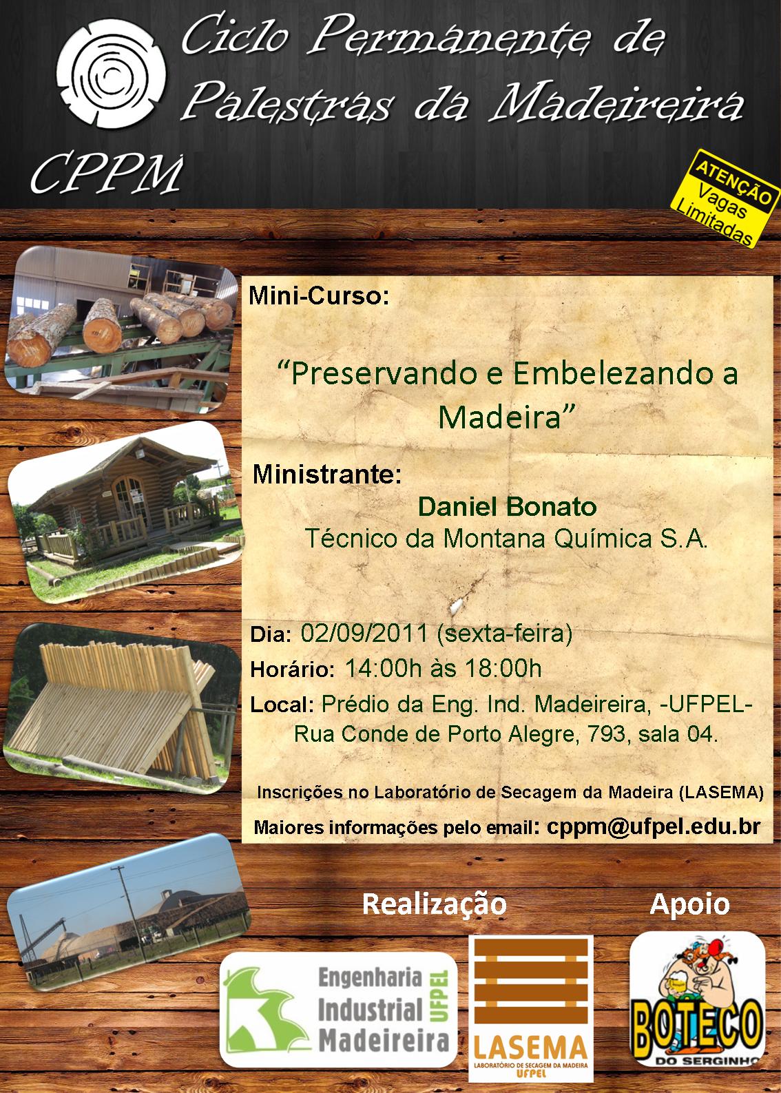 O Ciclo Permanente de Palestras da Madeireira terá mais uma edição no dia 2 de setembro (sexta-feira), com a realização de um mini-curso sobre “Preservação e embelezamento da madeira”, ministrado por técnico da Montana Química S.A. A palestra ocorrerá no prédio da Engenharia Industrial Madeireira, rua Conde de Porto Alegre, 793, às 14h, na sala quatro, e terá duração de quatro horas. Nesta edição, as inscrições devem ser realizadas pessoalmente no Laboratório de Secagem da Madeira (LASEMA), pois não serão aceitas na hora do evento.