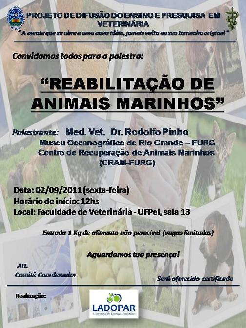 No dia 2 de setembro, na Faculdade de Veterinária (campus Capão do Leão), o grupo de pesquisas LADOPAR (Laboratório de Doenças Parasitárias), através do Projeto de Difusão do Ensino e Pesquisa em Veterinária, estará realizando palestra sobre animais marinhos em parceria com o Centro de reabilitação de animais marinhos de Rio Grande (CRAM). A inscrição é um quilograma de alimento.