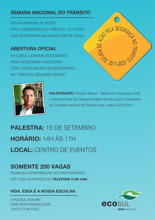 A Ecosul convida estudantes para assistir palestra com o especialista em segurança no trânsito, Eduardo Biavati, a realizar-se no dia 15 de setembro, às 14h, no Centro de Eventos (Fenadoce). O palestrante é mestre em Sociologia pela Universidade de Brasília (UnB) e membro titular da Câmara Temática de Educação e Cidadania do Conselho Nacional de Trânsito.
