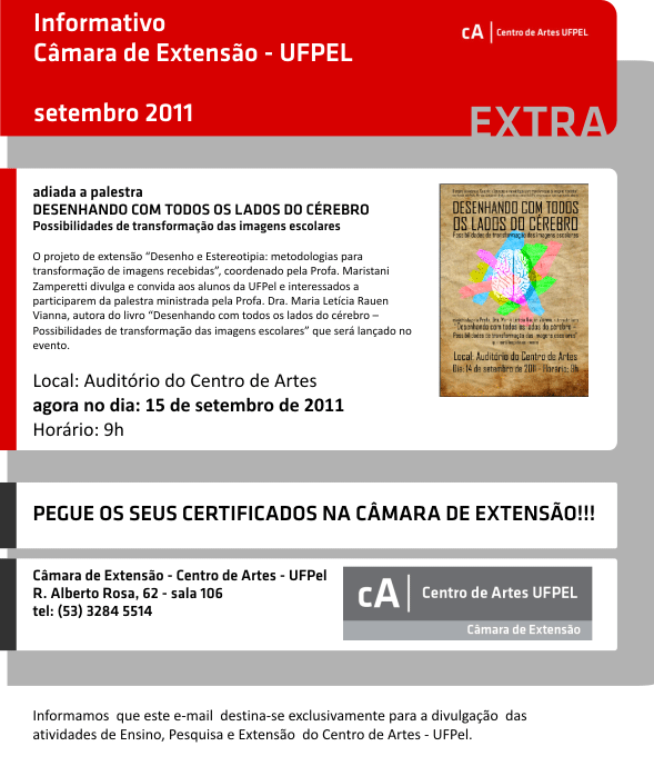Informativo Câmara de Extensão da UFPel Veja o Informativo Extra da Câmara de Extensão / Centro de Artes da UFPel Compartilhe: Clique para compartilhar no Facebook(abre em nova janela) Facebook Clique para compartilhar no X(abre em nova janela) 18+ Clique para enviar um link por e-mail para um amigo(abre em nova janela) E-mail Publicado em 12/09/2011
