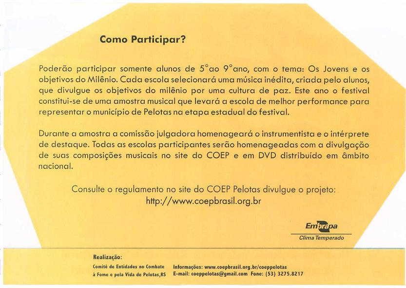 O Comitê de Combate à Fome e pela Vida (COEP – Pelotas) realizará o 5º Festival de Música, aberto aos alunos de 5ª à 9ª série, e se realizará no auditório do Colégio Municipal Pelotense, no dia 06 de outubro de 2011.