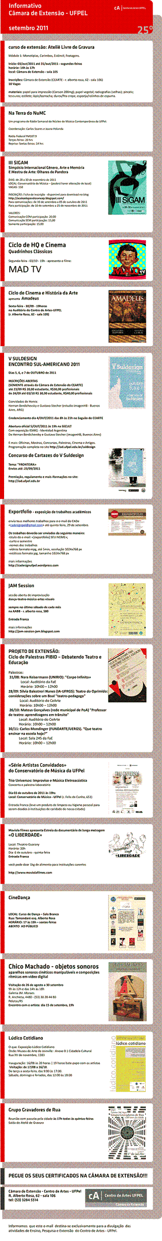 Informativo Câmara de Extensão Centro de Artes Compartilhe: Clique para compartilhar no Facebook(abre em nova janela) Facebook Clique para compartilhar no X(abre em nova janela) 18+ Clique para enviar um link por e-mail para um amigo(abre em nova janela) E-mail Publicado em 29/09/2011