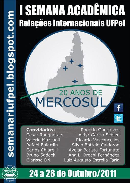 Será realizada entre os dias 24 e 28 de outubro I a Semana Acadêmica do Curso de Relações Internacionais da UFPel. O tema desta será ’20 anos do Mercosul0′, apresentado através de palestras e atividades delimitadas pelos seguintes sub-temas: