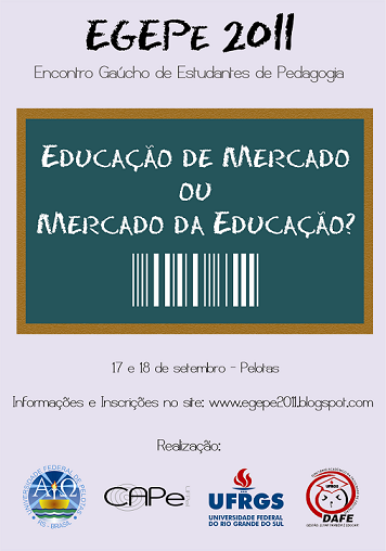 Tendo como tema central “Educação de Mercado ou Mercado da Educação?”, será realizado em Pelotas, nos dias 17 e 18 de setembro, no Auditório da Faculdade de Direito da UFPel, o Encontro Gaúcho de Estudantes de Pedagogia (EGEPe ). O encontro é uma parceria entre o CAPe – Centro Acadêmico da Faculdade de Educação/UFPel e DAFE – Diretório Acadêmico da Faculdade de Educação/UFRGS.