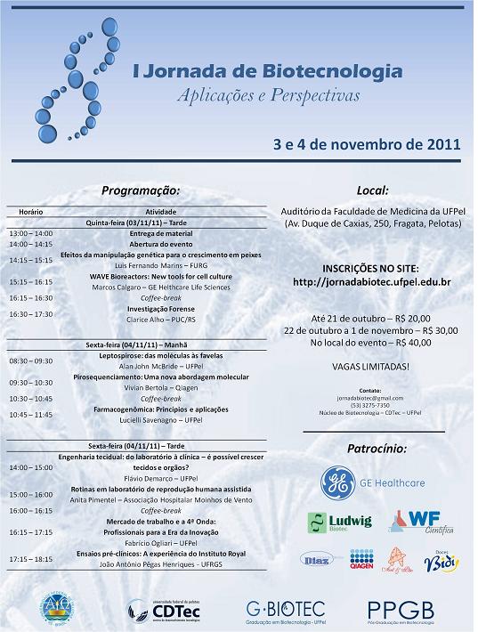 O Centro de Desenvolvimento Tecnológico (CDTec) da UFPel, em parceria com os cursos de graduação e pós-graduação em Biotecnologia, promove, nos dias 3 e 4 de novembro, a I Jornada de Biotecnologia, que terá como tema Aplicações e Pespectivas. Veja as demais informações no cartaz.