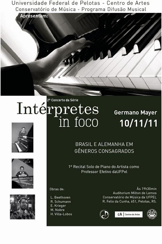 interpretes-em-foco.JPG O Programa de Difusão Musical do Conservatório de Música da UFPel apresenta: 2º Concerto da Série “Intérpretes em Foco” . Nesta quinta-feira(10) às 19h30min, no Salão Milton de Lemos do Conservatório de Música  (rua Félix da Cunha,  651). Pianista: Germano Mayer. Brasil e Alemanha em Gêneros Consagrados.