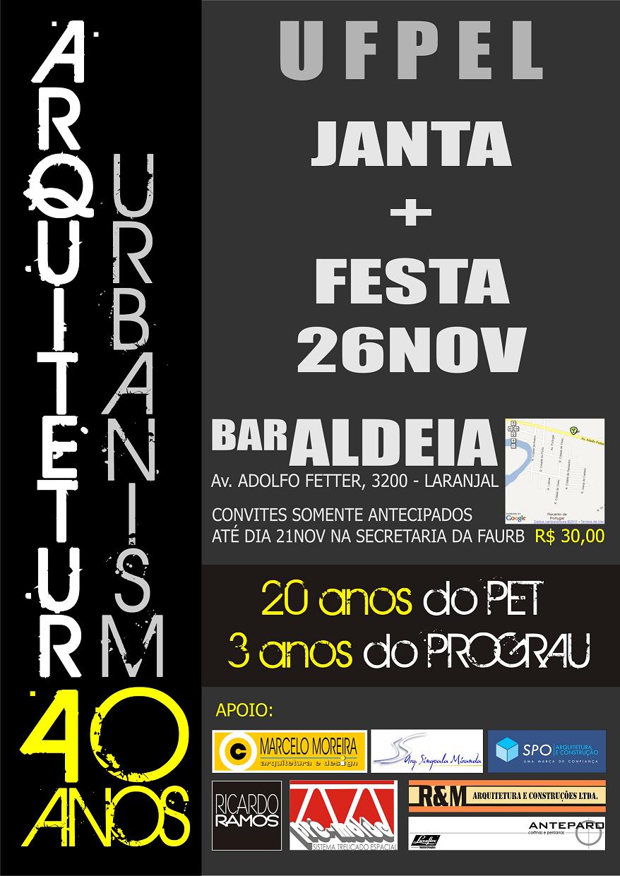 A Faculdade de Arquitetura e Urbanismo realizará jantar para comemorar a passagem dos 40 anos da unidade. Clique no cartaz para conferir todas as informações.