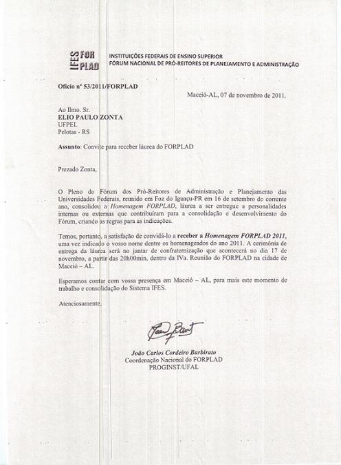 O pró-reitor Administrativo da UFPel, Élio Paulo Zonta, foi indicado a receber a Homenagem FORPLAD 2011, láurea instituída pelo Fórum Nacional de Pró-Reitores de Planejamento e Administração, em reconhecimento àqueles que contribuíram para a consolidação e desenvolvimento do referido Fórum.