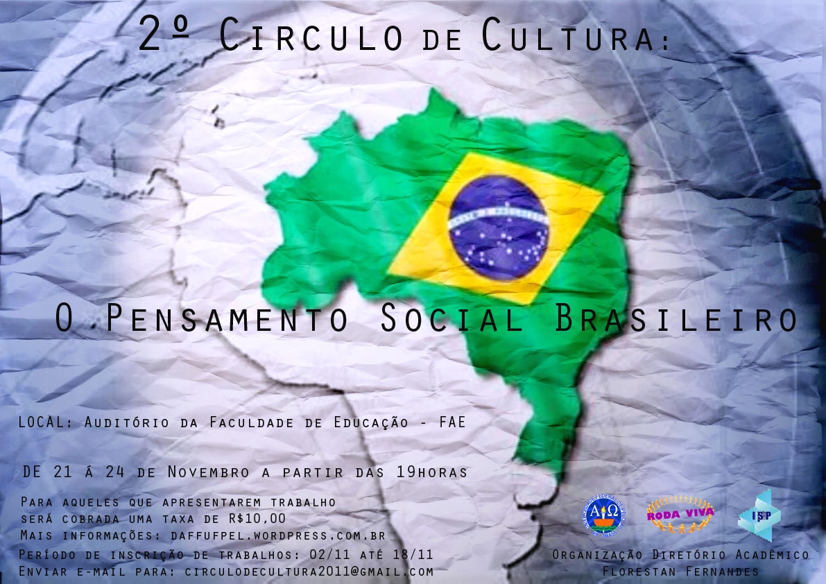 O Diretório Acadêmico Florestan Fernandes, do curso de Ciências Sociais, realizará o 2º Círculo de Cultura – O Pensamento Social Brasileiro, entre os dias 21, 22, 23 e 24 de novembro, na FAE (Faculdade de Educação), com início as 19h. Envio de trabalhos até o dia 18 de novembro. Mais informações, acesse blog do daff: http://daffufpel.wordpress.