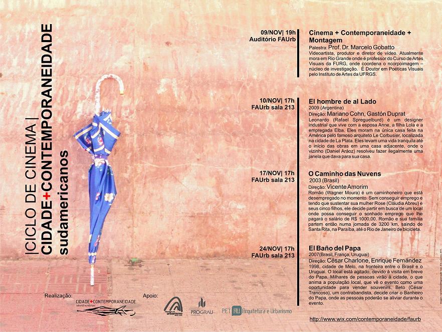 O grupo de estudos Cidade+Contemporaneidade (www.wix.com/contemporaneidade/faurb), do Laboratório de Urbanismo (LabUrb), da Facudade de Arquitetura e Urbanismo (FaUrb) da UFPel, promove de 9 a 24 de novembro o Ciclo de Cinema Cidade+Contemporaneidade: Sudamericanos.