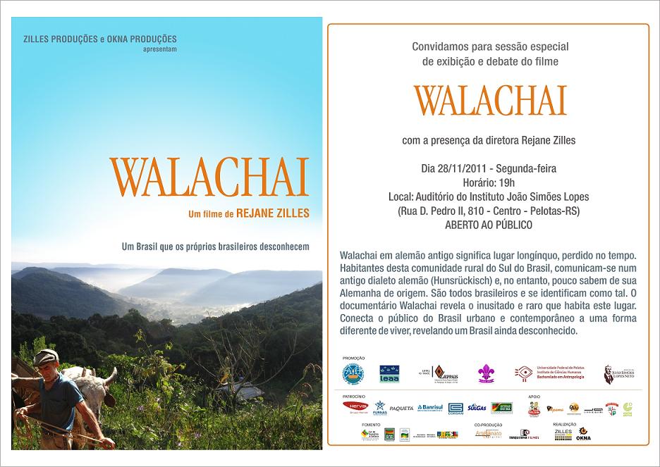 Com estréia nas salas comerciais de Porto Alegre no dia 18 de novembro, o documentário Walachai, dirigido por Rejane Zilles será exibido em sessões comentadas em centros culturais e universidades a partir da próxima quinta-feira, dia 17 de novembro (confira programação abaixo). As exibições terão a presença da diretora e de integrantes da equipe técnica.
