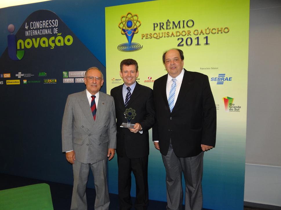 O professor Odir Dellagostin, do CDTec, recebeu na noite desta quinta(17) o prêmio Pesquisador Gaúcho, concedido pela Fapergs. O prêmio consiste de um troféu e de 10 mil reais. O pró-reitor de Pesquisa e Pós-Graduação, professor Manoel Maia, prestigiou a cerimônia. Na foto, os professores da UFPel aparecem na companhia do presidente da Fapergs, Rodrigo Matos(D).