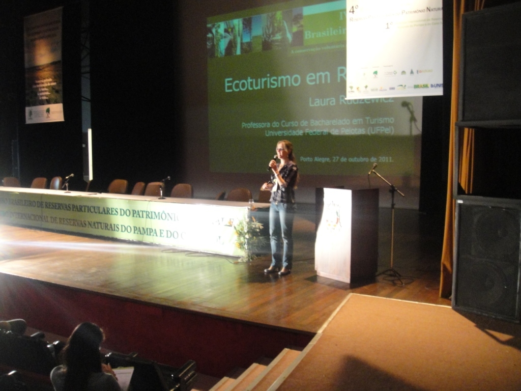 Laura ministrou curso sobre o planejamento e a infraestrutura do ecoturismo nas RPPNs e apresentou o trabalho intitulado “Potencialidades do Ecoturismo no litoral médio e sul do Rio Grande do Sul”, demonstrando resultados da pesquisa realizada durante o Projeto Lagoas Costeiras I, patrocinada pelo Programa Petrobras Ambiental entre 2007-2009, cuja segunda edição já se encontra em andamento em outros três municípios do litoral médio do estado, tendo a UFPel como parceira institucional.