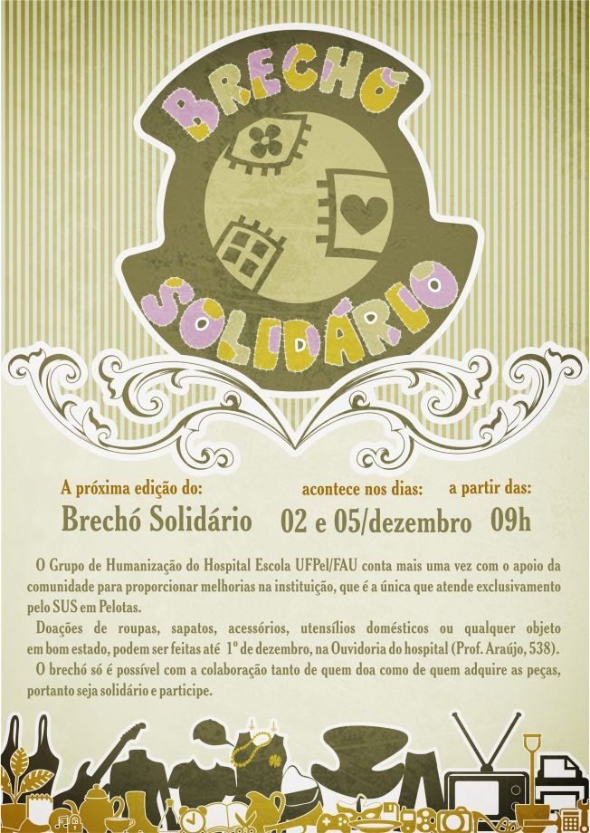 brecho-solidario.JPG O Grupo de Humanização do Hospital Escola UFPel/FAU promove mais uma edição do Brechó Solidário. Será no período de 2 a 5 de dezembro, a partir das 9h.