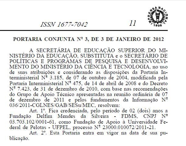 A Fundação Delfim Mendes Silveira está comunicando que foi publicada, no Diário Oficial, a portaria nº 3, que recredencia o órgão como Fundação de Apoio à Universidade Federal de Pelotas, junto ao MEC, processo nº 23000.010072/2011-21. Clique na imagem para ler a publicação no DOU.