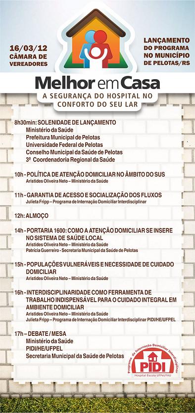 A implantação pioneira do programa no município foi alavancada pela experiência de quase sete anos do Programa de Internação Domiciliar Interdisciplinar (Pidi), do Hospital-Escola da UFPel, cuja atuação, em parceria com a Secretaria Municipal de Saúde, está voltada para o atendimento domiciliar de pacientes oncológicos.