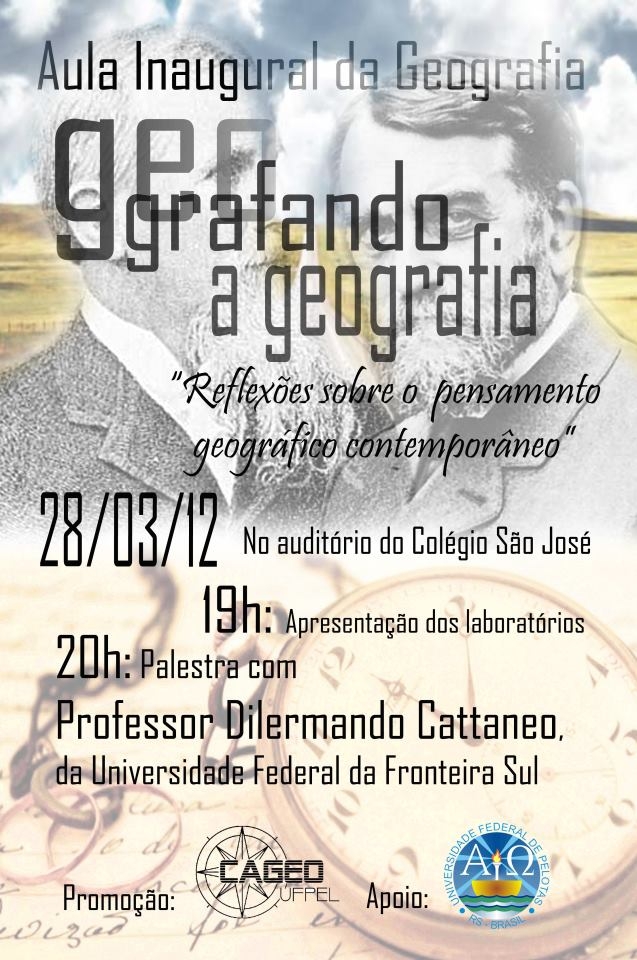 O Centro Acadêmico do curso de Geografia (Cageo) convida os estudantes e professores do curso para a aula inaugural intitulada “Geografando a Geografia – Reflexões sobre o pensamento geográfico” que ocorrerá no dia 28 de março, às 19h, no Auditório do Colégio São José. Num primeiro momento, haverá uma apresentação dos laboratórios de pesquisa e extensão e, posteriormente, uma palestra com o professor Dilermando Cattaneo, da Universidade Federal da Fronteira Sul.